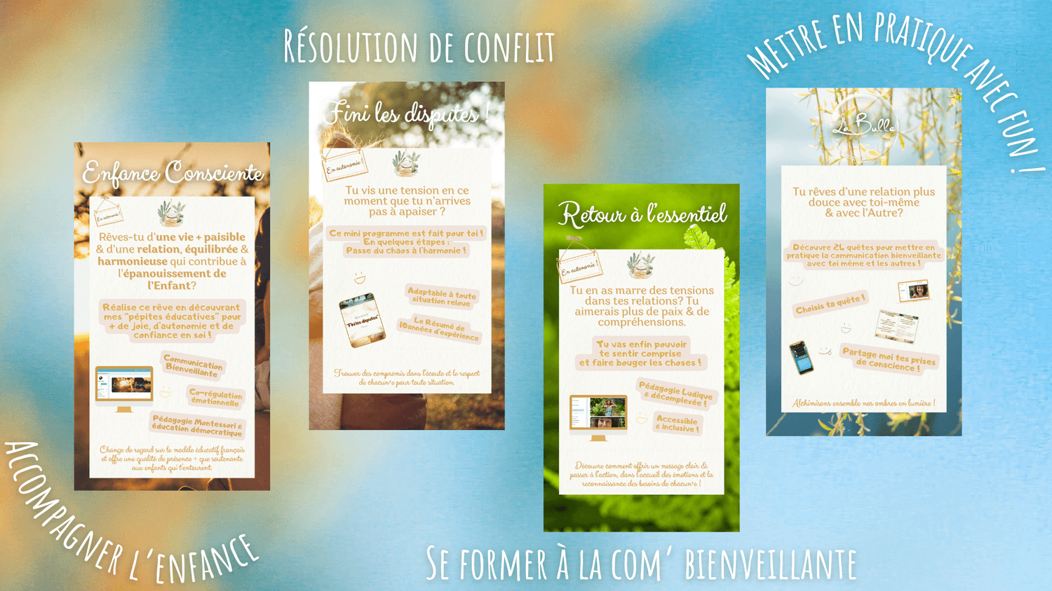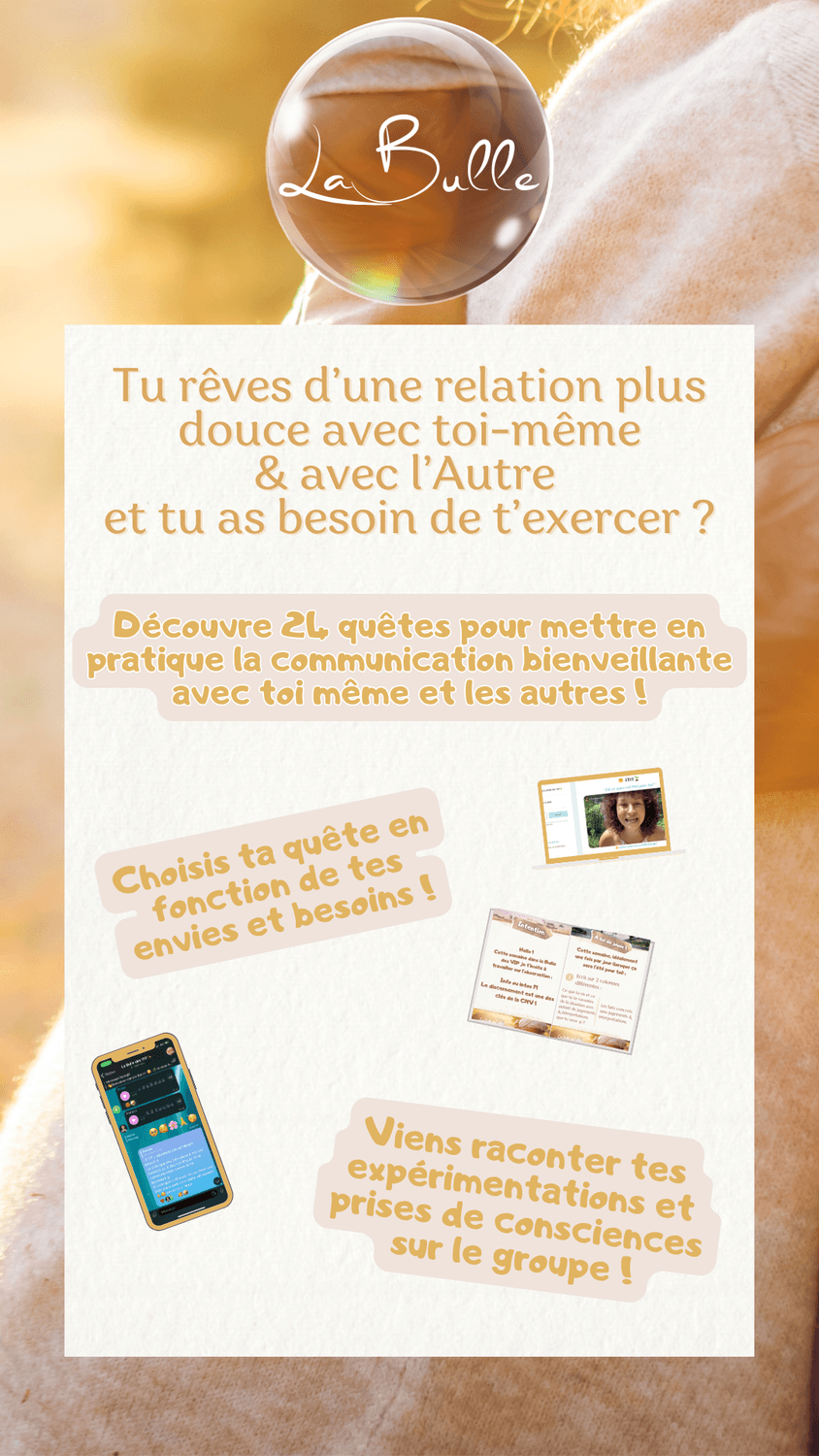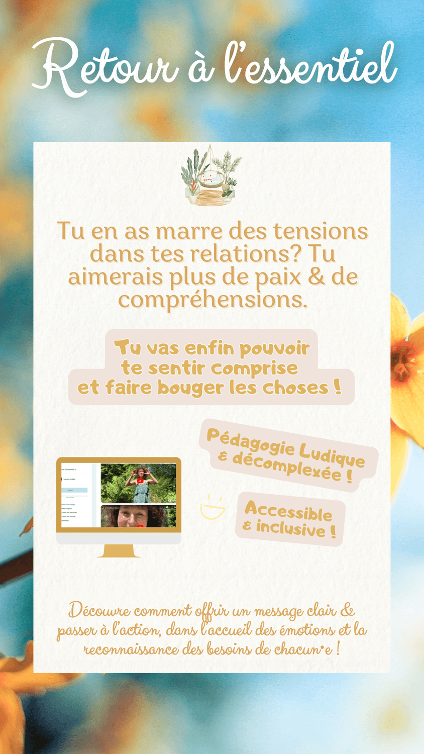 À travers la communication bienveillante, la sophrologie, la pédagogie Montessori, l'internal family systems et une approche "neuro-émotionnelle", j’aide à comprendre ce qui se joue à l’intérieur quand on se sent challengé émotionnellement ou relationnellement pour pouvoir transformer et faire évoluer la situation d'une manière épanouissante.