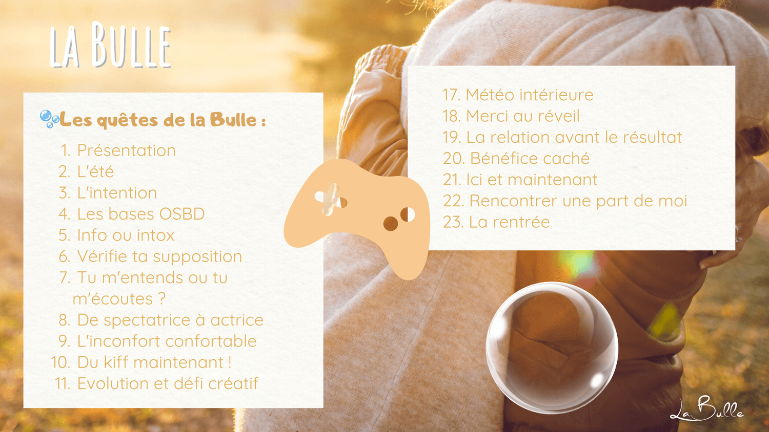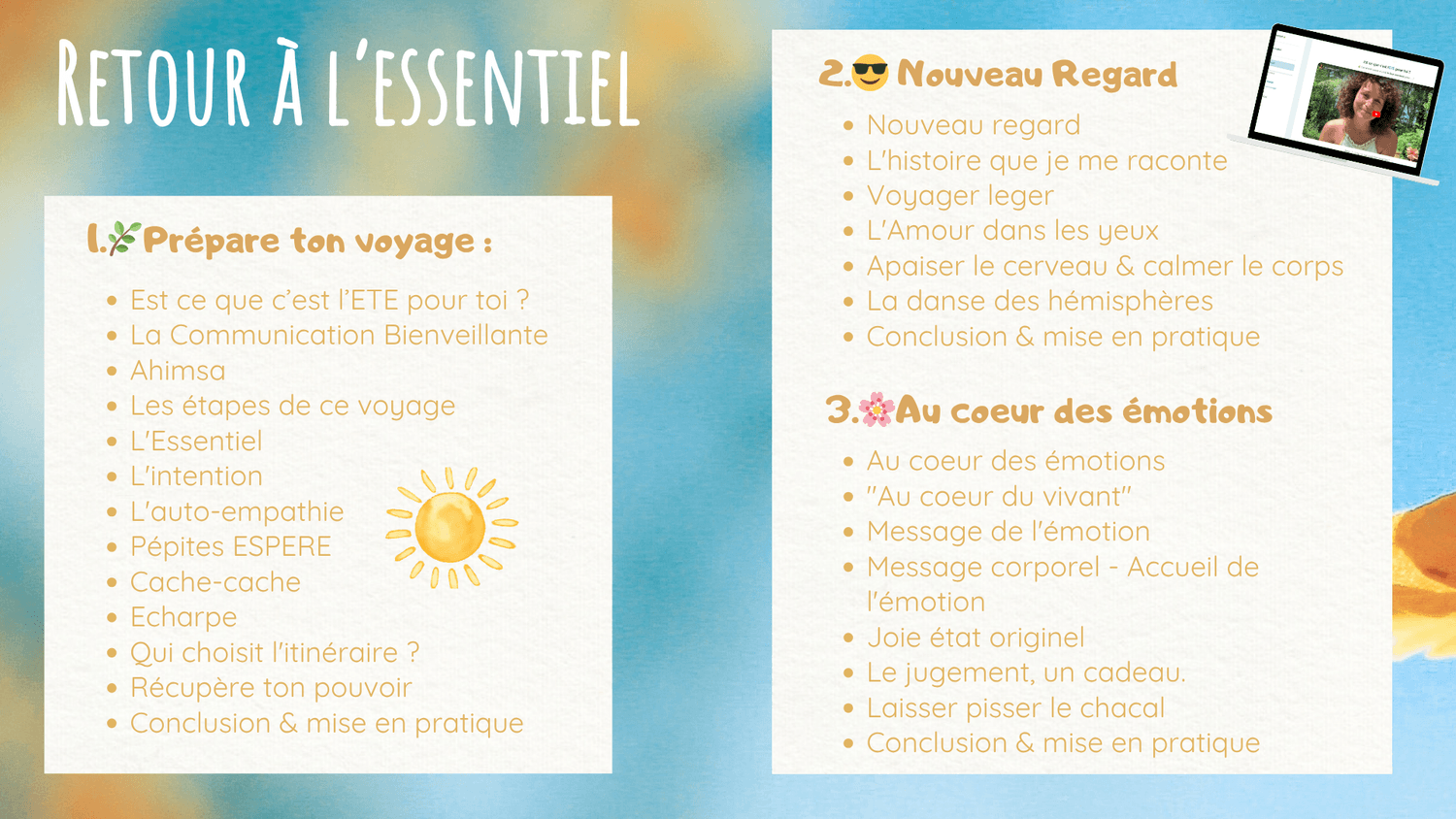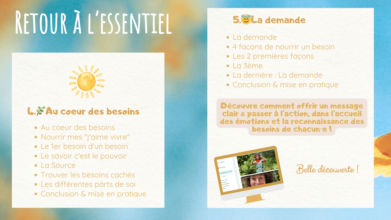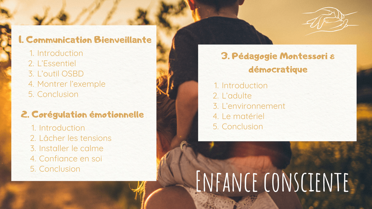 À travers la communication bienveillante, la sophrologie, la pédagogie Montessori, l'internal family systems et une approche "neuro-émotionnelle", j’aide à comprendre ce qui se joue à l’intérieur quand on se sent challengé émotionnellement ou relationnellement pour pouvoir transformer et faire évoluer la situation d'une manière épanouissante.